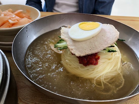 We tried Dwaeji Gukbap, a cloudy pork soup served with rice on the side and a tray of condiments including shrimp paste, chives, and pepper. We also ate Milmyeon, an icy broth for which the city is especially known. The dish is very popular way to both cool down and nourish during the foetid heat of a Korean summer. Milmyeon, made of wheat and potato starch noodles was born out of post-war scarcity in the 1950’s when , the more traditional buckwheat noodles were substituted for the latter. Post-war scarcity reshaped Korean cuisine. In the 1950s, wheat flour and starch from U.S. military aid were more accessible than traditional ingredients, while buckwheat remained familiar and adaptable. Milmyeon emerged as a pragmatic hybrid—stretching buckwheat noodles with American supplies to recreate Pyongyang-style cold noodles in the South.