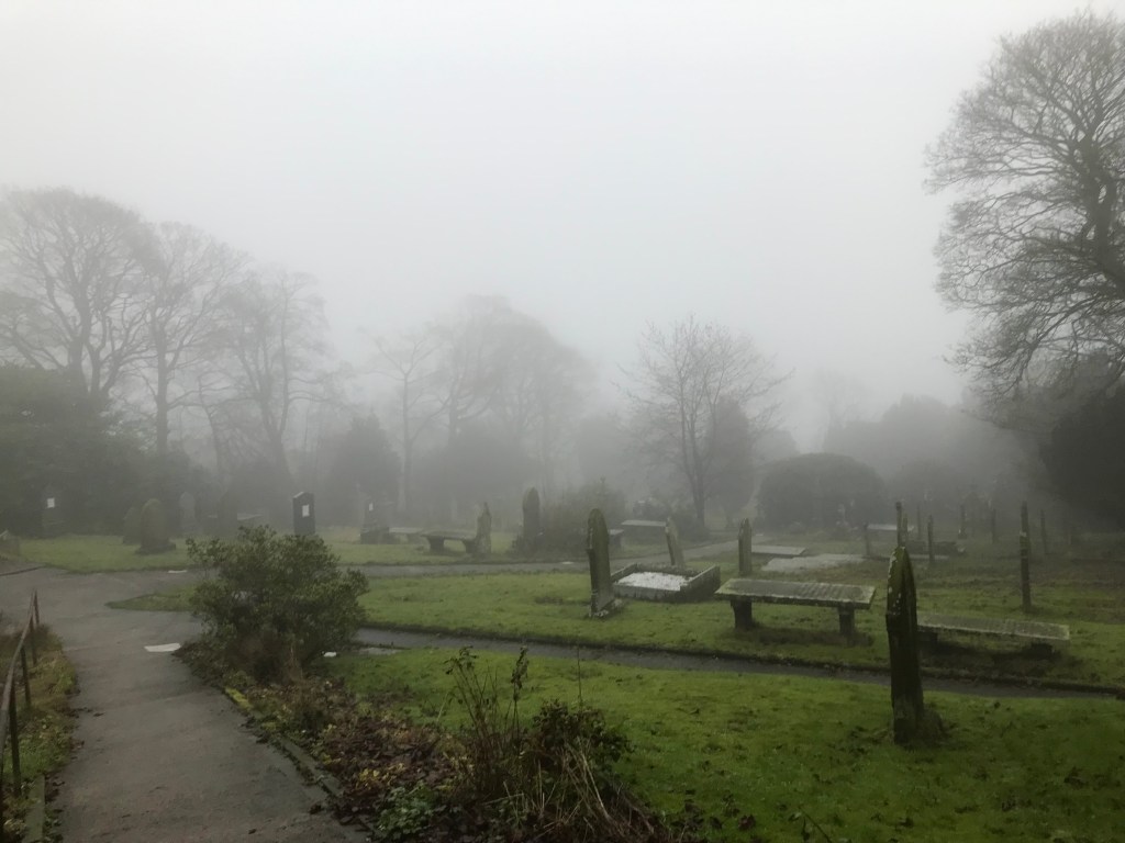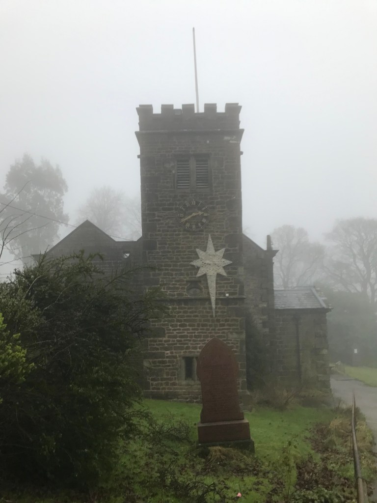 The village sits below Pendle Hill. The hill was not visible to the eye when we visited the area a couple of days ago and found it smothered in a dense fog. We did, however, manage to visit St. Mary’s church in the village for a short time. We left for home before darkness fell as the road had disappeared completely!